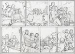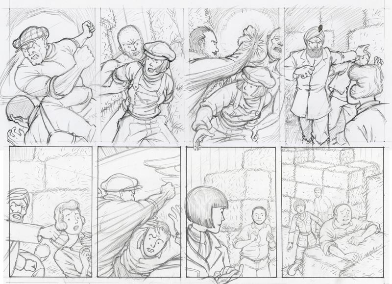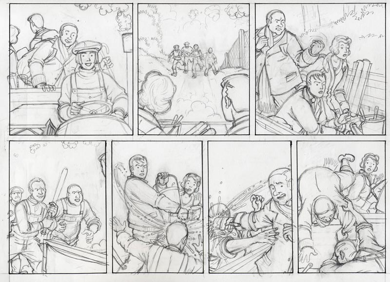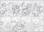 Now it is time to start the actual artwork. The originals were drawn on A3 Bristol Board with a clutch pencil. The tiers and borders are laid out, reference material is piled up close by and the hours are swallowed up! I will often sketch ideas or difficult poses in my sketchbook (or on the back of the script) during this phase before committing them to the master page.