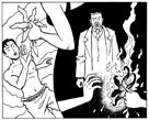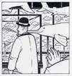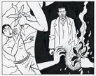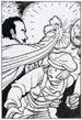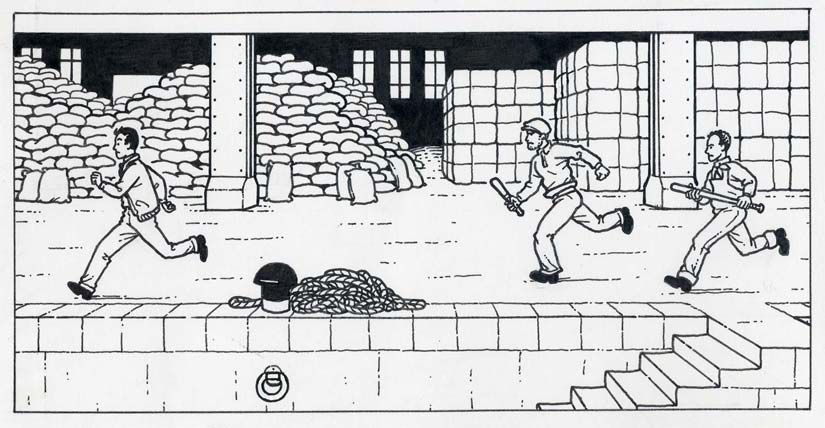 When the page has been inked, and the pencil erased away, the page is scanned into the computer (Photoshop running on an Apple Mac) as a 600dpi bitmap, and there will usually be a little extra 'digital inking', meaning a bit of a tidy up and adding any white lines, which I used to do with white ink, but now mainly do digitally (see last example above).