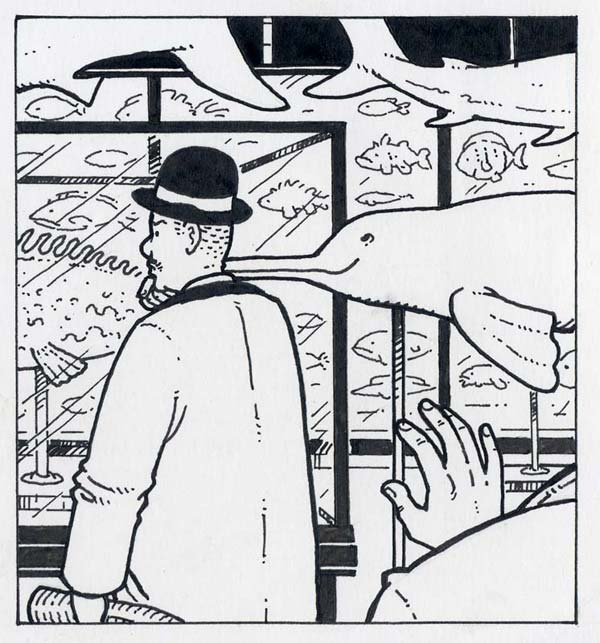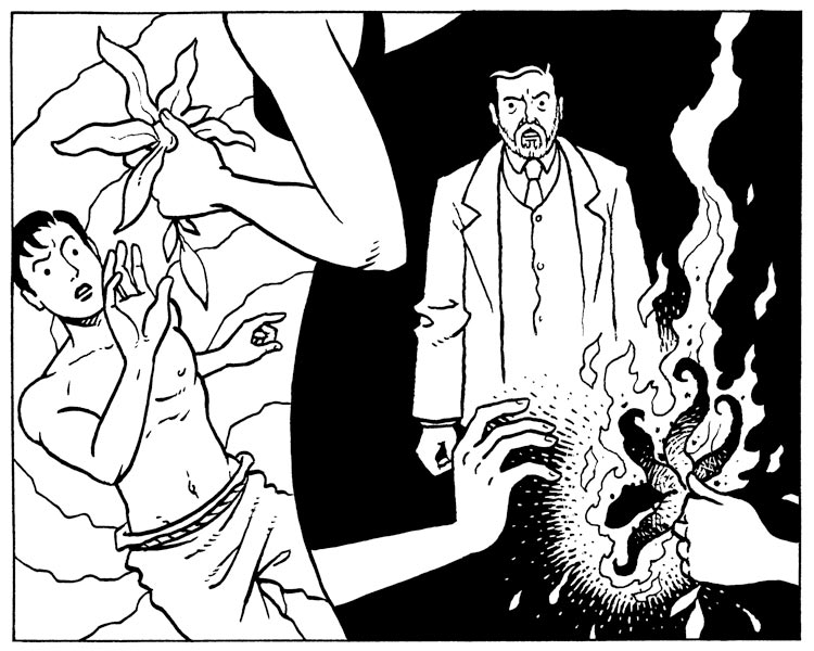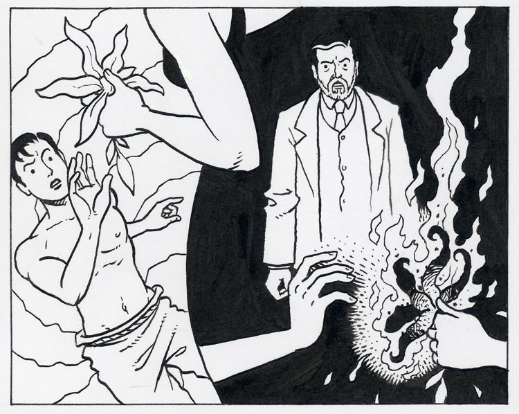 Inking is a fairly simple process as most of the drawing decisions have been made while pencilling, but concentration is needed as the drawings are finalised and 'made real'. I used a dip pen with a Hunt 107 nib which gives a pleasing clean line and is nicely responsive to width variation depending on how hard you press on the paper (the more pressure, the wider the tines separate, allowing a thicker flow of ink through). Some earlier pages of The Rainbow Orchid (pages 4-36 of volume 1 and pages 37-45 of volume 2) were drawn with a Rapidograph, a more technical pen with a flat line. You can see the difference between the two lines below.