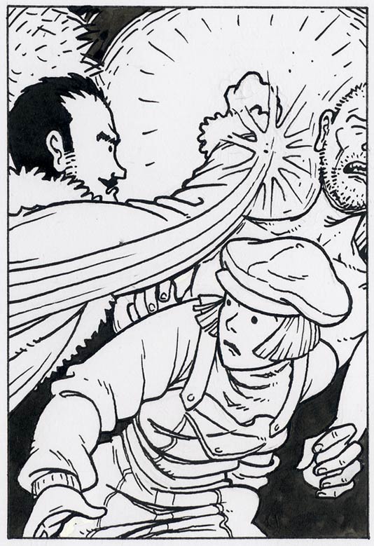 I soon moved to dip-pen only (though now I do a lot more fully digital work), with the Rapidograph is used for straight ruled lines where needed (eg. panel borders and architecture). You can see a video I made about dip pen nibs here. Solid blacks are filled in using a brush. Here are some examples of inked panels.